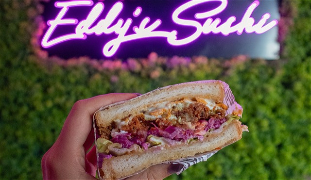 Inside: roze rijst, visfriet, wasabimayo, gebakken uitjes, komkommer